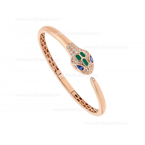 Bvlgari Serpenti 18K roségouden armband bezet met blauwe saffierogen, malachietelementen en pave-diamanten