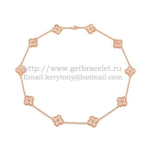 Van Cleef Arpels Alhambra lange ketting roze goud 10 motieven met pave diamanten